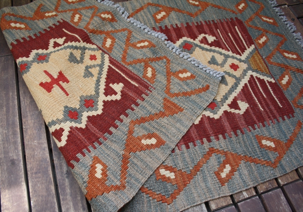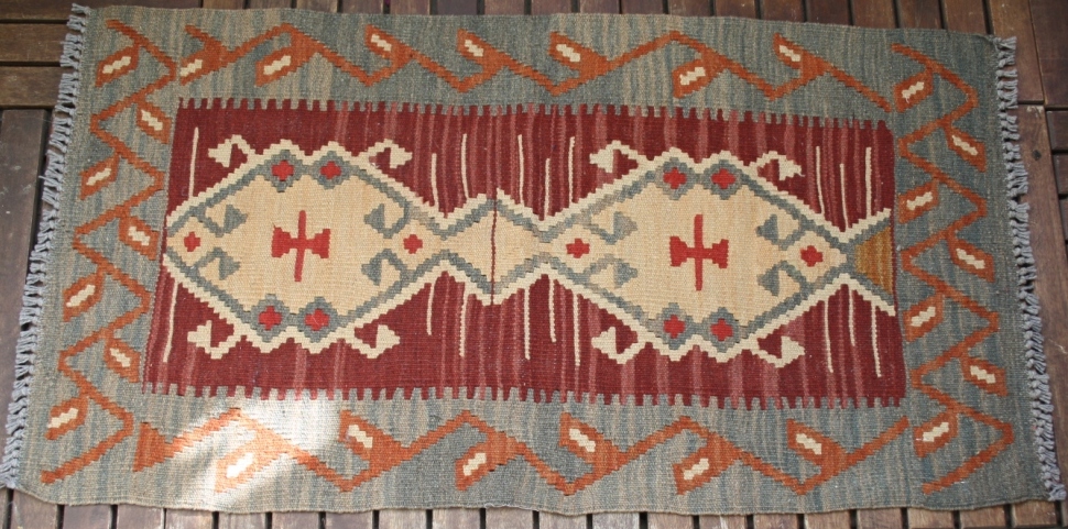 Handvävd ny klassisk kelim i 100% ren ull. Färger i vinrött, rost, gråblått, mm. Symboler för bla onda ögat amuletter som skyddar mot faror och olyckor, vargfot mfl. Fackmässig vatten tvätt. Stl ca 97x52.